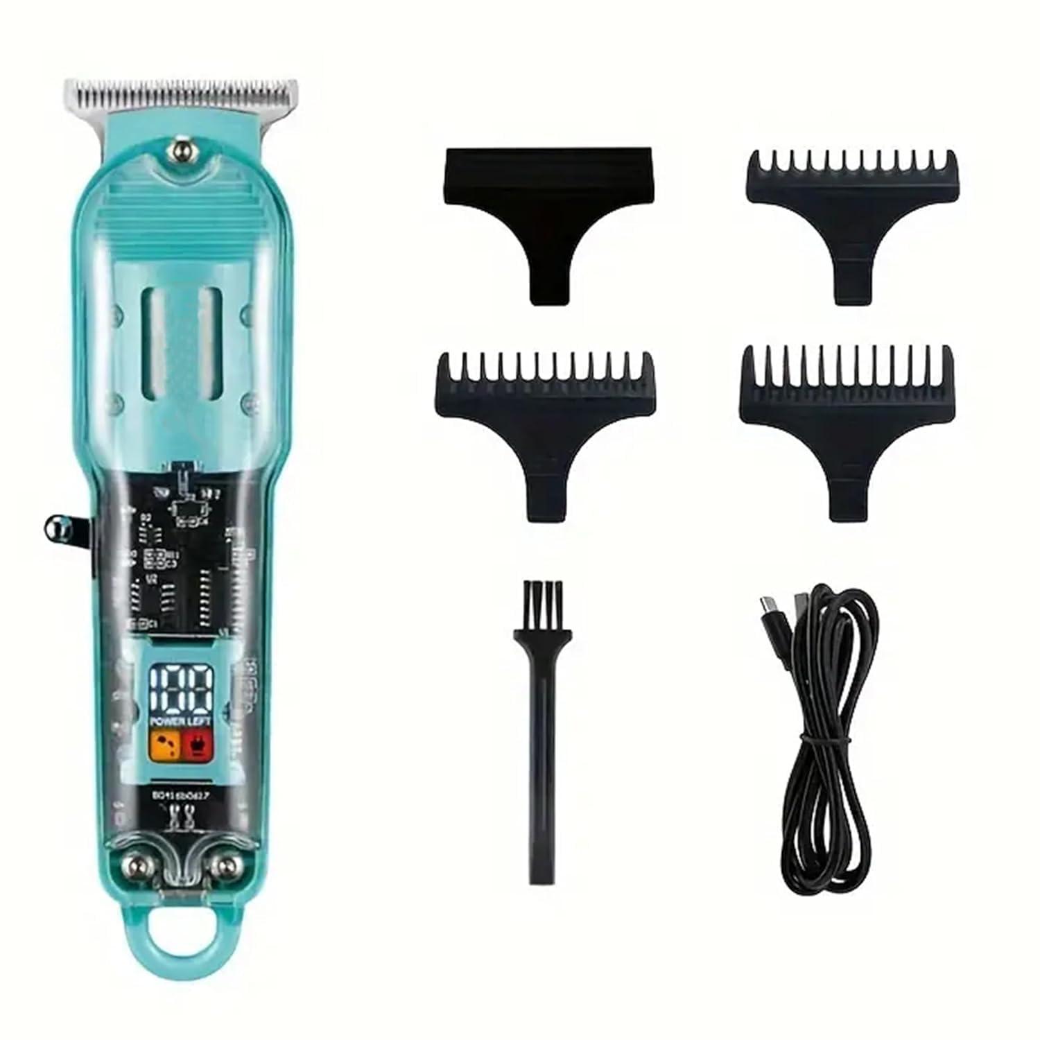 Achieve a professional-quality haircut at home with this cordless, rechargeable hair trimmer. It features a transparent body that showcases the internal circuitry, a powerful motor, and a clear LED display showing battery life. A full 2-hour charge provides 180 minutes of working time, making it ideal for both personal and professional use.