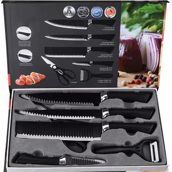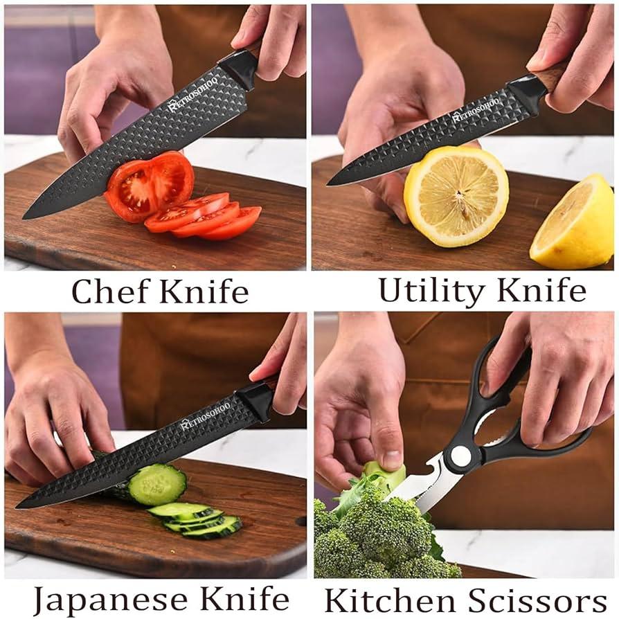 This Sets of KitchenKnife, Sharpener consist of different sizes of knives with different function. It consist of kitchen knives, pricing knife, scissors, mini cutlass use for cutting bony fish , chicken, turkey etc and a chopping board. It is made of metal blade and abs plastic head. It does not rust, very strong, easy to wash and store, a must have for every kitchen and a great value for money.